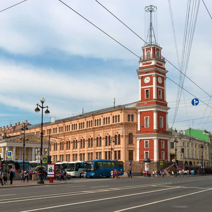Вы выходите на Невский проспект рано утром, когда город только просыпается, и сразу замечаете стройную красно-белую стрелу — Башню Городской Думы. Ее часы тихо отбивают время, а вокруг уже ровно течет невский поток людей и трамвайных звуков. Берете кофе в одной из соседних кофеен, садитесь на парапет у Гостиного двора и наблюдаете, как в окнах башни отражается бледное петербургское небо.