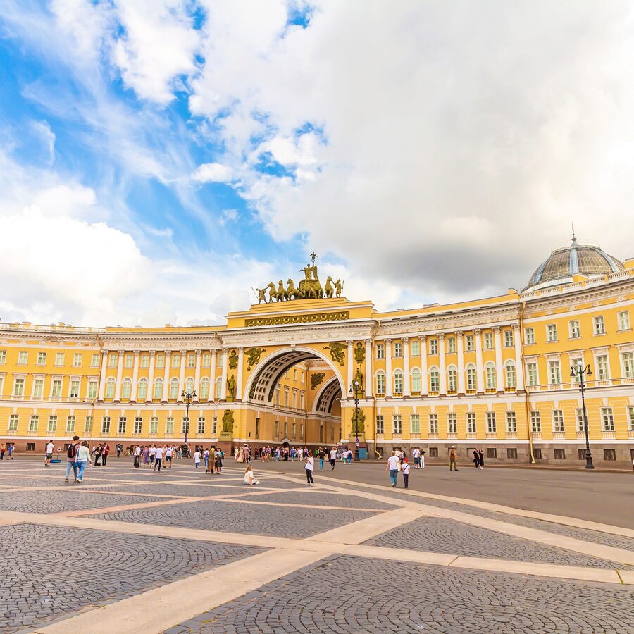 Пока площадь еще не заполнилась экскурсиями, загляните во двор Эрмитажа или купите онлайн-билет и пройдите в музей без очередей. Если хочется просто насладиться пространством — присядьте у арки Главного штаба, любуясь симметрией фасадов и глянцем мостовой после ночного дождя. Уличные музыканты, кареты, фотографы — все как на старинной открытке.