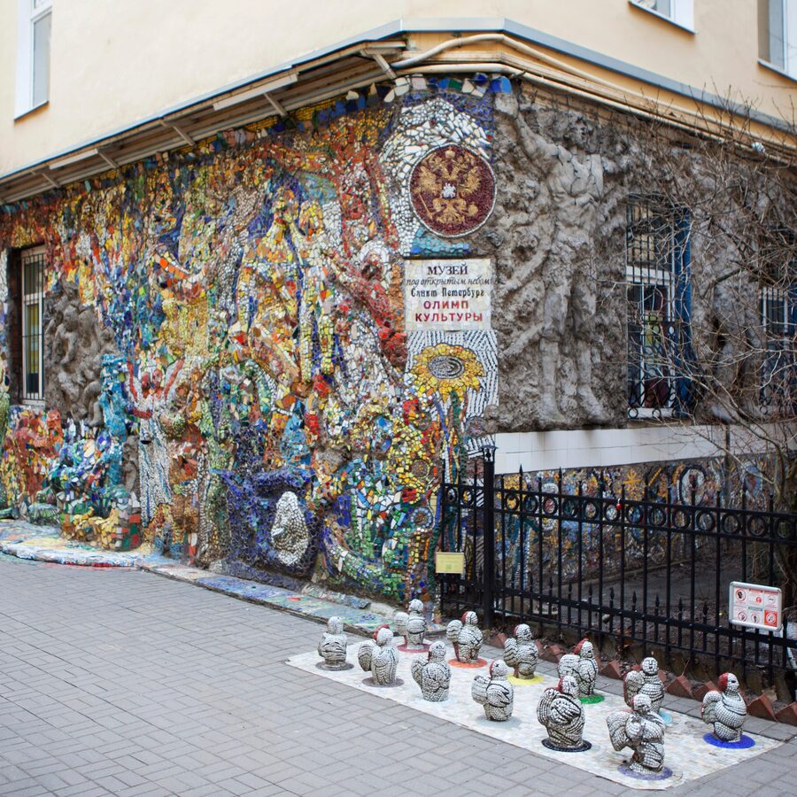 1) Мозаичный дворик Владимира Лубенко создан художником и его учениками из Малой академии искусств в 1990-х и продолжает расти: новые панно и элементы регулярно добавляются, превращая двор в живой арт-объект Санкт-Петербурга.