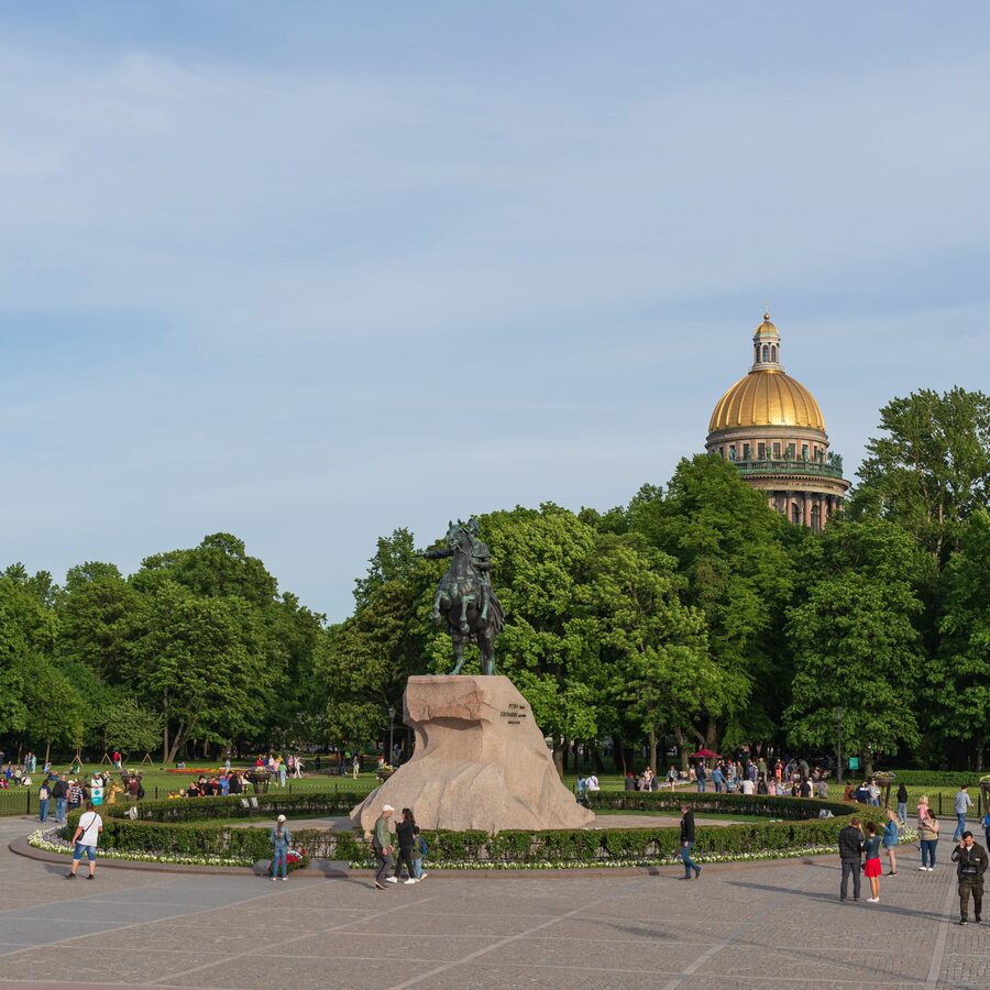 - Главный символ площади — памятник Петру I «Медный всадник» (1782), созданный Этьеном Фальконе по заказу Екатерины II. Постамент — легендарный Гром‑камень, крупнейший в истории монолит, перевезённый из Лахты по суше и воде.
