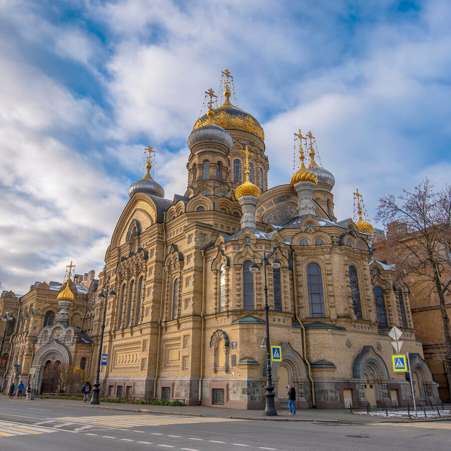 - Храм воздвигнут в конце XIX века в русско-византийском стиле. проект связан с мастерской Василия Косякова — автора Никольского морского собора в Кронштадте. Монументальные пятиглавие и высокая колокольня формируют один из самых выразительных силуэтов Васильевского острова на фоне Невы.